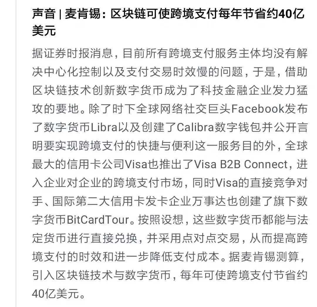 今天,麦肯锡指出,未来区块链技术在跨境支付的应用,每年可以通过区块链技术节省约40亿美元okx,而巨头公司Visa、万事达卡等也积极开展区块链技术布局。