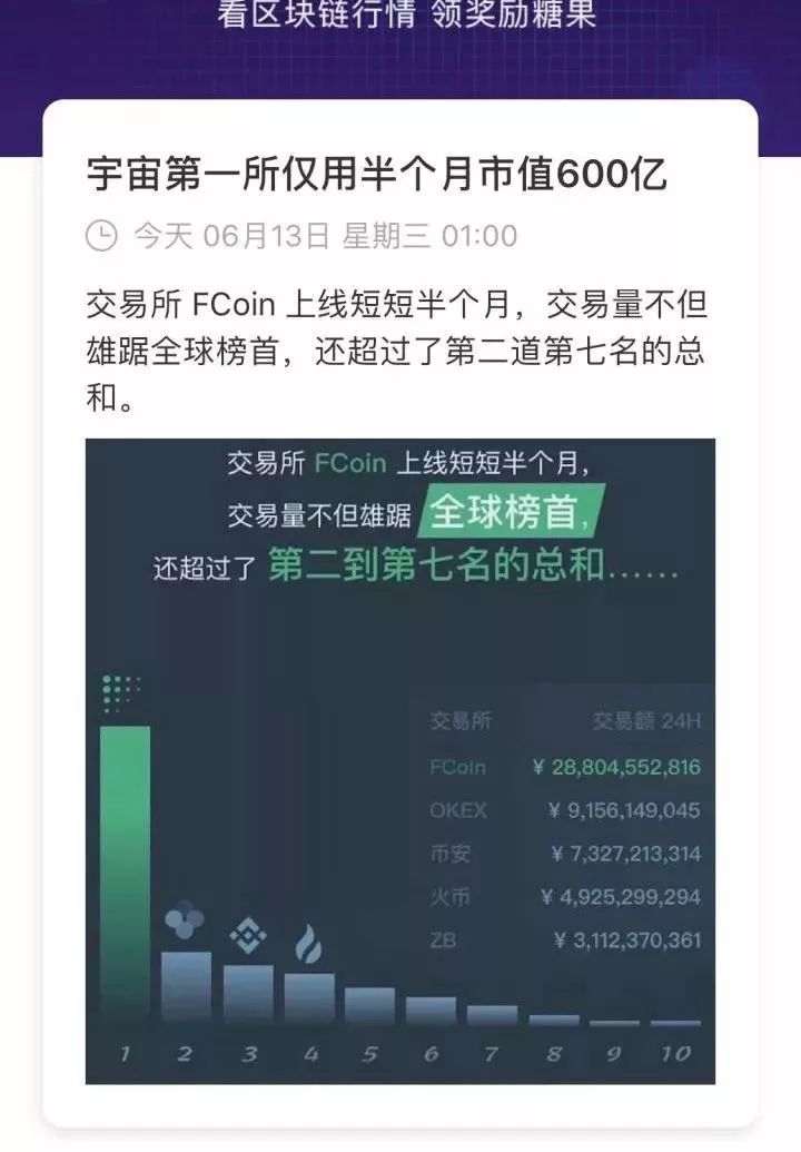 这是FCoin在各大网络媒体发布的消息,FCoin用了15天时间,就超越了OKEx、币安、火币等6家交易所交易量的总和,相比私募价,交易所平台币也上涨了百倍之多。