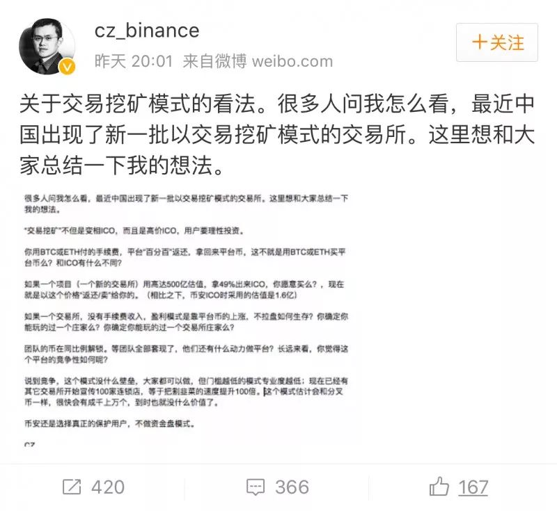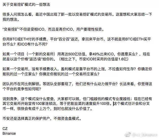 昨晚,币安创始人赵长鹏发微博称,国内最近出现了一批采用交易挖矿模式的新交易所,很多人问他对此有何看法,于是赵长鹏分享了自己对交易挖矿模式的一些看法。