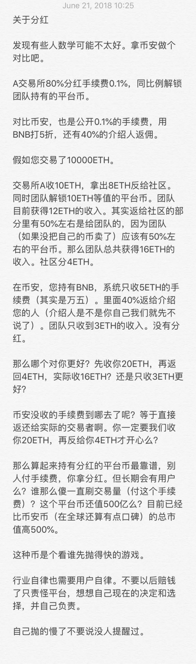 今日,赵长鹏又发微博称,“对用户来说,持有获得分红的平台币看似靠谱,但没有哪个用户会长期持有,也不会有哪个用户为了支付手续费而不断增加交易量。平台币市值500亿,比币安币总市值高出500%。行业自律也需要用户自律。”