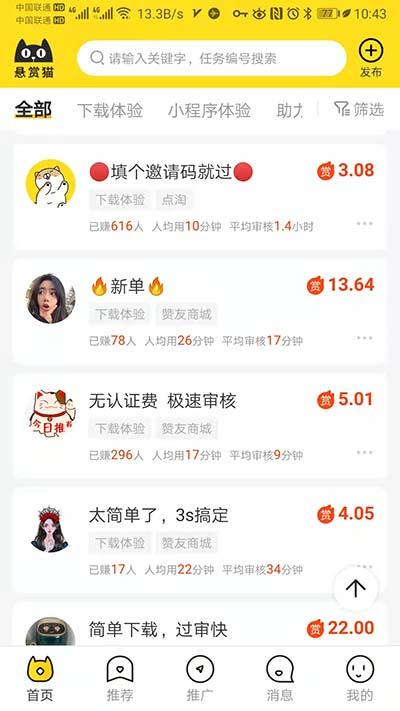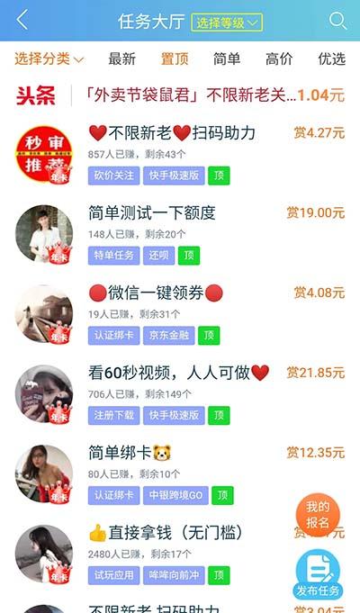 打开上面的文字链接进入,按照提示下载并安装闪帮赚APP,然后打开APP并登录即可完成任务并赚取佣金。 平台上有大量的赚钱任务供大家选择,任务类型也比较丰富。 我个人更喜欢下载体验,因为这种任务不仅简单而且单价很高。 几分钟完成一个订单就可以赚1-10元的佣金,每天做几个小时就可以赚100元。