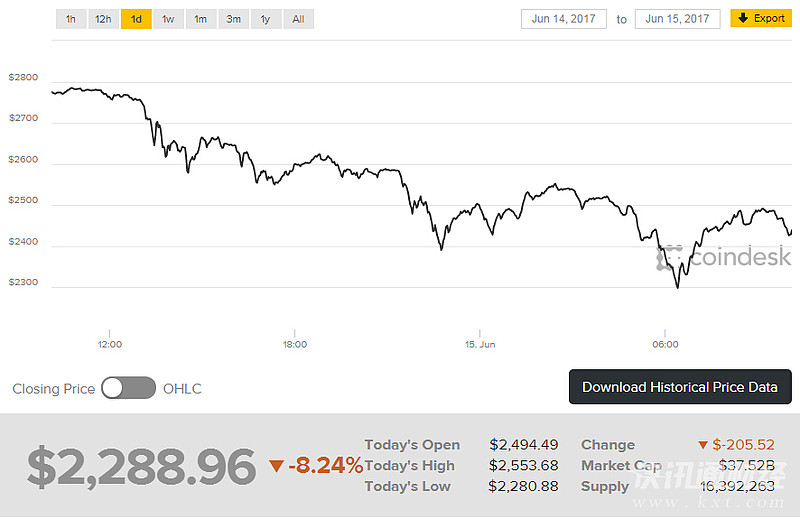 截至目前,网站数据显示欧意交易所,比特币价格目前为2288.96美元/枚,日内下跌200美元,跌幅8.24%。
