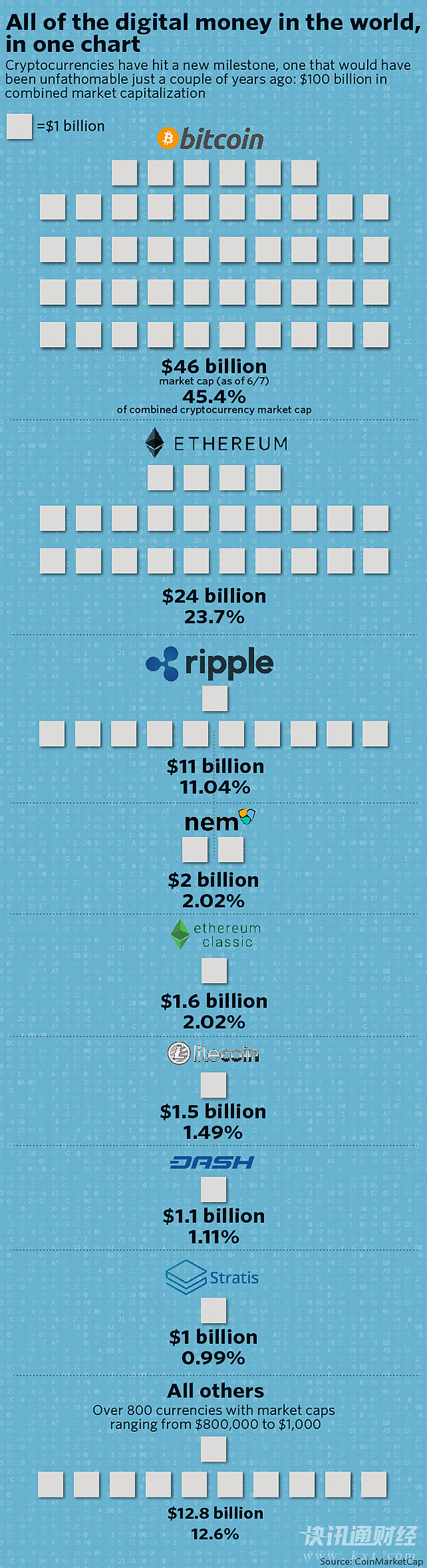 其中,今年表现极为出色的比特币自然也不落后。其市值约占整个数字货币市场的一半,达到460亿美元,占比45.4%。