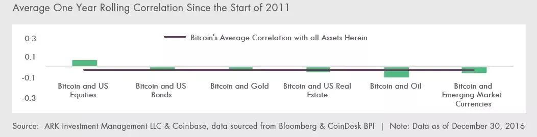 比特币到底是投资资产还是投机资产,是引起很多学者兴趣的话题。 Dirk(2017)和Chris(2017)分别将比特币与收益的相关性与其他资产(外汇、股票、债券、贵金属和能源)的收益进行了比较,均得出比特币与其他资产保持一贯的低相关性的结论。结论,所以无论是在稳定的市场时期还是在波动的市场时期,比特币都是分散风险的良好投资。