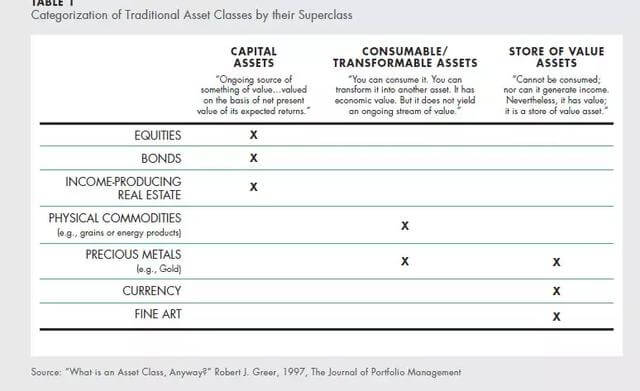 对于数字货币的分类,存在不同的看法。 1997年,J提出Super Class的概念,根据传统资产类别的特点,分为资本资产(包括股票、债券、房地产)、消费/可变资产资产(包括商品和某些贵金属) ,以及价值储存资产(例如某些贵金属、货币和艺术品)。按照这一超类分类,数字货币同时具备三类属性,将数字货币划分为任意一类都是不全面和片面的。
