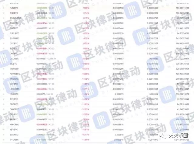 由于大量代币被按市价抛售,大部分币种开始下跌,市场不明真相的散户也加入恐慌性抛售。币安BTC交易对中,只有10余个币种处于正常状态,其他币种均在下跌。