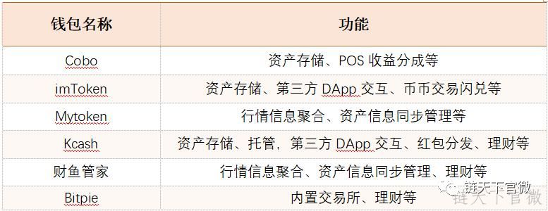此外,随着市场越来越成熟,互联网玩法逐渐被引入数字货币领域。比如钱包从简单的资产存储功能发展到支持POS收益分享、引入金融产品、允许币币交易兑换、行情信息聚合、DApp交易跳转等,具体情况如下: