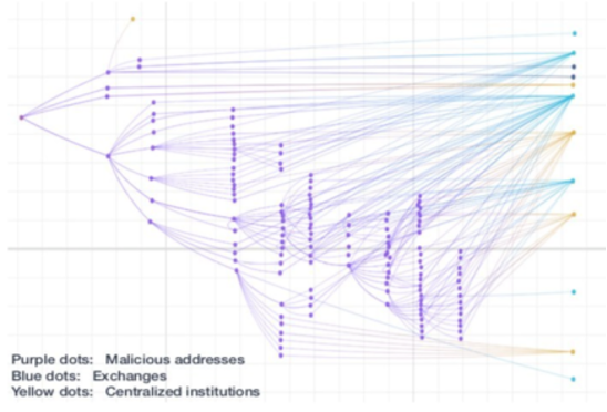 美国几乎所有的交易所都是合法的,所以所有美国的交易所都包含在内。下图中紫色部分就是所谓的洗钱单位,黄色部分是中心化组织,蓝色部分是交易所。可见,每一笔交易是否流向好的交易所,还是洗钱的交易所,美国监管机构都心知肚明。 2020年5月,他们发现一些交易所100%洗钱。如果你不小心将比特币或以太坊发送到此类洗钱交易所,你将被美国联邦调查局或美国国土安全部指控洗钱。他们可能不会逮捕任何人,但事件会被记录下来。所以任何想要洗钱的人都应该使用现金,而不要使用数字货币、比特币或以太坊,因为使用数字货币后,数据将保留在区块链上,永远不会被删除。总有一天它会被公开。