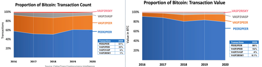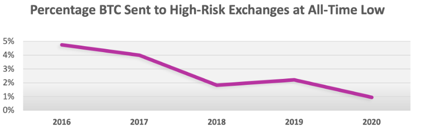 大多数交易所成立后都已经合规,因此洗钱变得越来越困难。现在如果想用比特币或者以太坊来洗钱,基本上很难找到合规的交易所来接受。通过高风险交易所进行的比特币交易越来越少。可见国外监管的效果是好的。
