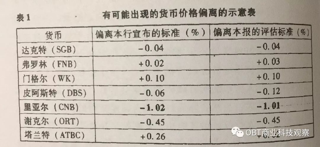 在市场经济环境下,媒体及时、严格的舆论监督,确保信息充分公开、透明,是市场机制良好运行的关键环节。如果银行家未能及时做出反应以确保币值稳定,成千上万的猎犬就会扑向银行家并咬他。媒体可能会发布一份每日图表,不仅反映各种货币之间的汇率,还表明每种货币的当前价值以及其价值与公布的商品价值衡量标准的偏离程度。如下表所示。 (每张纸币后面均附有发钞机构的大写字母缩写)【摘自《货币非国家化》2019年版-P46,海南出版社,姚中秋译】