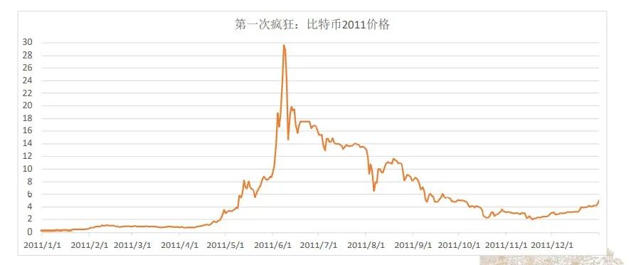 上图显示了2011年比特币价格的疯狂变化:从不足1美元飙升至约30美元。综合来看,今年比特币价格暴涨主要有以下三个原因: