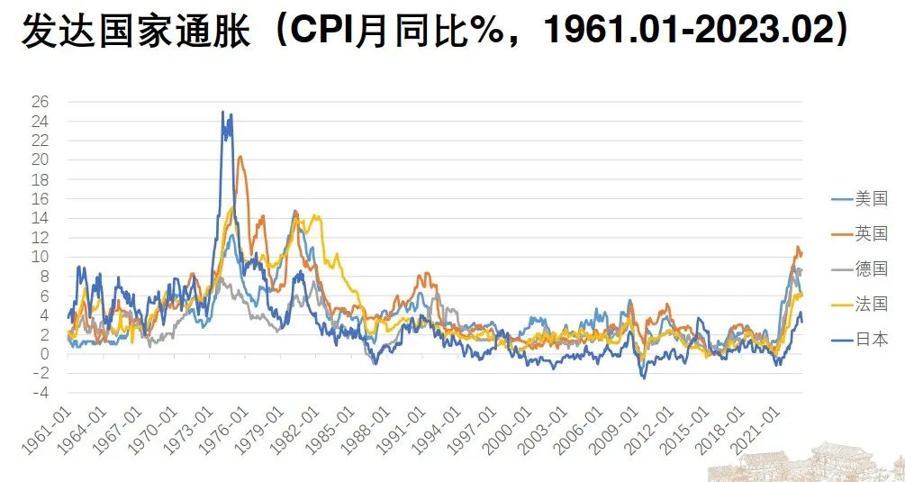 本轮发达国家的高通胀也在伤害现有的货币体系,尤其是美国的通胀。从上图可以看出,目前发达国家的通货膨胀率是20世纪70年代以来最高的。