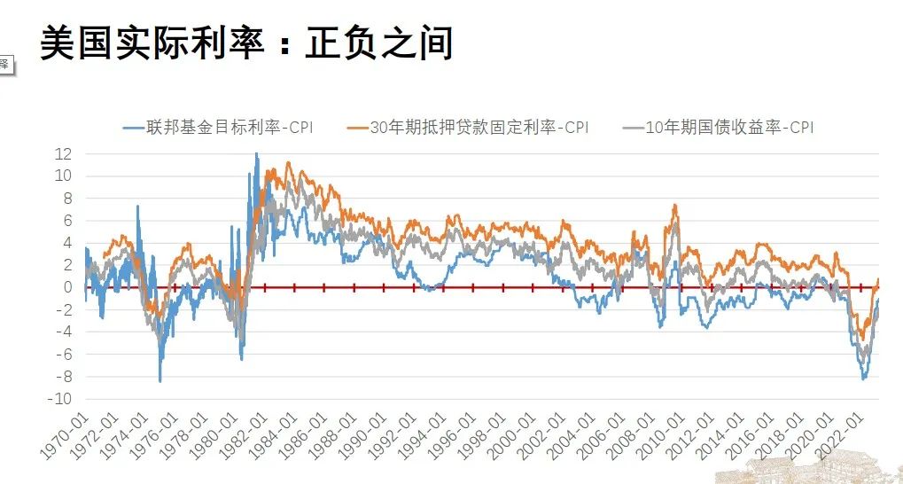 令人担忧的是,这种高通胀的局面似乎一时半会儿还无法消除。为什么会发生这种情况?上图中的红色直线是零点线,蓝色、橙色和灰色曲线是实际利率线。不难看出,目前美国30年期房贷利率略为正,十年前的政策利率和国债利率仍为负。从某种意义上说,美联储的政策虽然因为多次加息而显得紧缩,但实际上仍然是宽松的,因为实际利率仍然为负。在这种情况下,高通胀率可能很难降低,因为要降低通胀,需要的是紧缩的货币政策,而不是“明紧”的货币政策。这给了我第一个怀疑美国通胀是否会持续、甚至可能再次发生的理由。