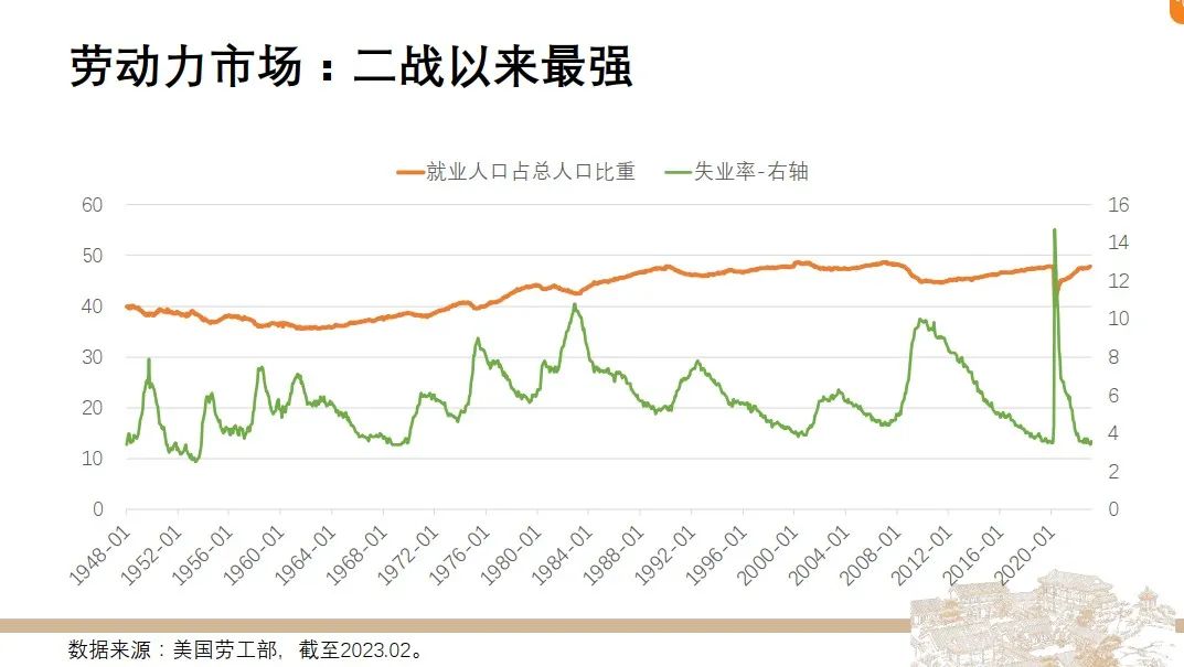 如果你仔细观察劳动力市场,情况同样紧张。上图中的橙色线代表就业人口占总人口的比例。该变量不包括劳动参与率。不过,橙色线的“尾巴”仍然达到局部高点。所以,现在美国的失业率非常低,劳动力市场非常紧张,想要降低通胀非常困难。