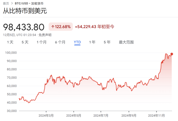 截至发稿时,比特币的交易价格为每枚 98,433.8 美元。今年以来,比特币涨幅超过122%。