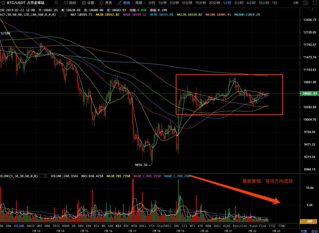 BTC:继续缩量盘整,盘整区间为10000-11000美元。日线层面,已成功站上MA60日均线上方,短期下跌趋势有所缓解。小时线上,处于7月18日放量上涨后的区间盘整走势,量能略显不足。大饼在小团体之间波动,赚钱很难。对于我们来说,还是以观望为主。打破局面其实很简单。关注上下区间(1/11,000美元)的突破/击穿,等待庄家动作。