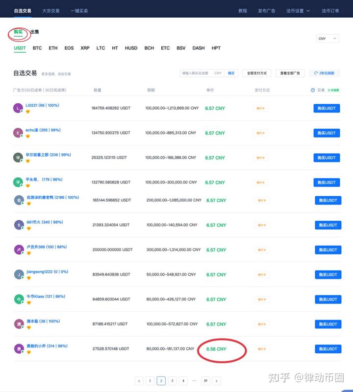1. 点击“购买”链接(即OTC商家向您出售币)。 我们发现至少有 40 个页面、数百个商家在出售 USDT; 购买单价为6.56元至7.23元;