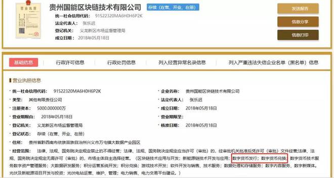 其中,海南乐动接到删除“数字货币交易”的命令后,最新一家拥有“数字货币发行和数字货币兑换”的公司出现在贵州,全国唯一一家!