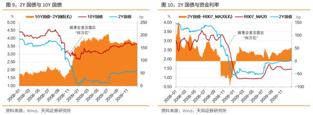 在降低前两个利率中,十年期债券利率下降了速度。最后三个降低利率降低了长期利率的下降趋势削弱。在引入了4万亿政策之后,两年内国库券的绩效表现更好。在前两个降低利率降低的10年2年债券利率利率上升范围缩小,并在引入4万亿政策后扩大。 10年期债券利率的低点发生在2009年1月7日,而2年债券利率的分阶段低点发生在1月9日。在触底后,10年的国库券债券逆转和向上。受益于低利率的资金利率,2009年上半年的2岁债券的上升是有限的,并且成熟度的扩展进一步扩大。