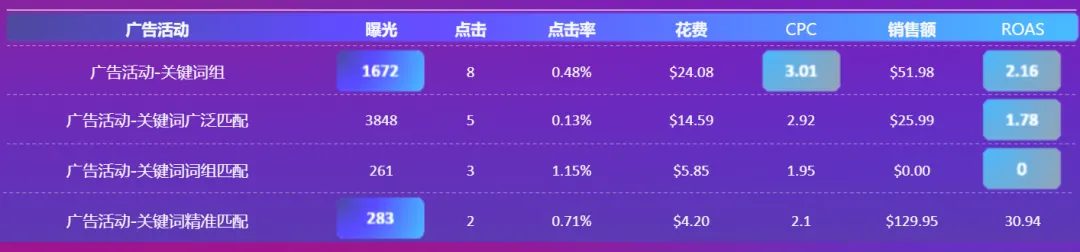 解决方案:启动四个广告活动,并测试[关键字组]和传统的三种匹配方法的性能。
