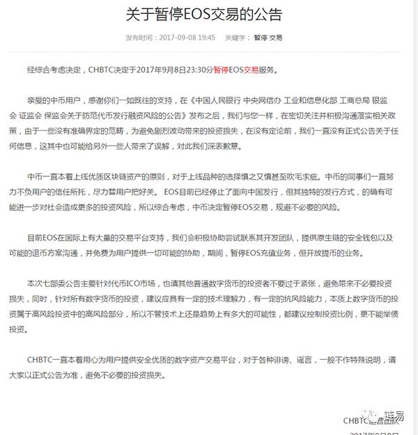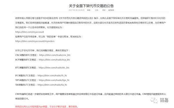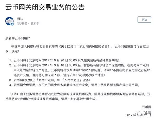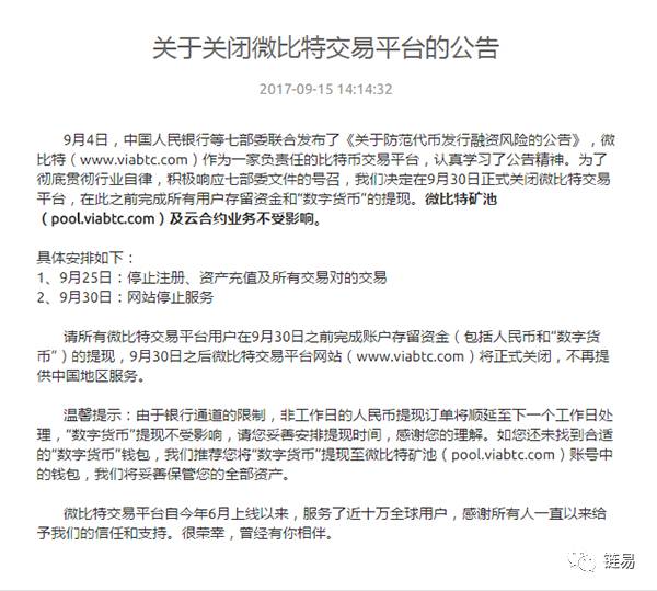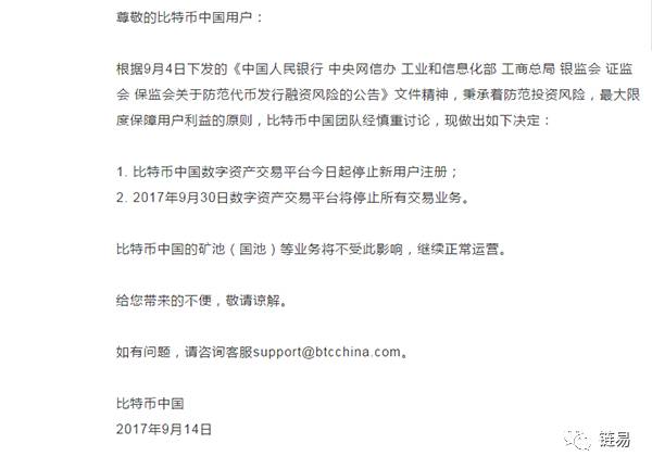 中国比特币是中国三个主要的虚拟货币交易平台之一,还发布了公告,宣布它将停止所有交易业务并停止9月30日的新用户注册。