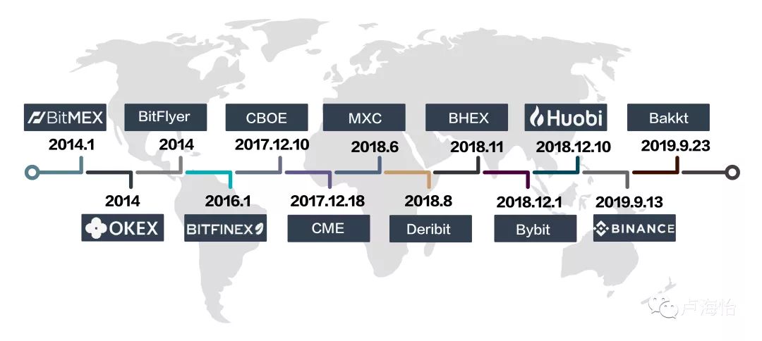 由于交流的数量大量,我在上述时间表中大致列出了一些市场关注的交流。就时间而言,衍生品交易所的开发时间与货币价格的波动有关,尤其是在2014年和2018年,在线上有许多交流,并且与市场存在一定的滞后。数字货币现货市场的上升市场促使交易所以衍生品上网,满足投资者对数字货币的投资需求,当时现货市场不再迅速上升或正在下降,以便为套期保值和投机性衍生品提供全面发挥。为了发展交流,过去两年中的主要交流显然已将他们的努力转移到现货市场战斗之后。新兴交易所也在2018年推出,传统金融机构也在2017年底开始进入市场。