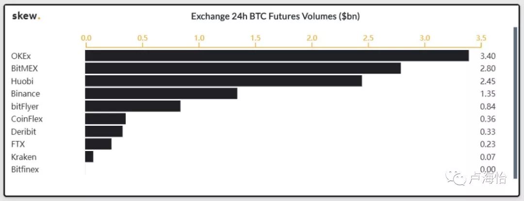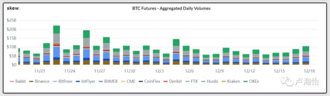 这项研究的这一部分主要选择了Okex,Huobi等主流交易所的比特币期货交易量。由于比特币期货交易占整个期货交易市场的60%以上,因此该研究主要使用Skew的比特币期货交易数据。