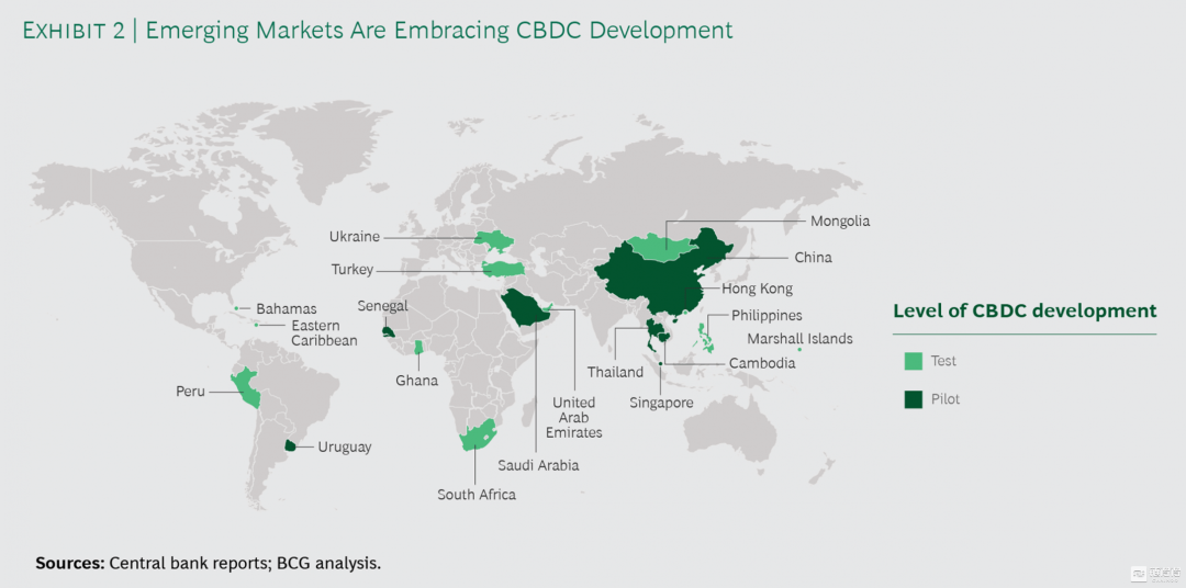 新兴市场拥抱央行数字货币:内测、试点; (来源:BCG)