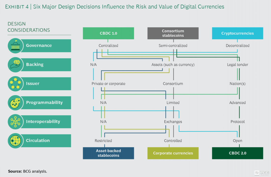 影响数字货币风险和价值的六大设计决策(来源:BCG)
