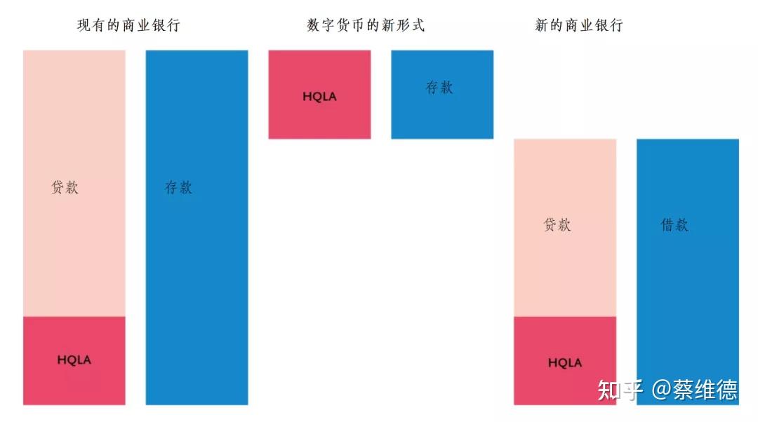 银行是实体经济最大的贷款机构。 由于贷款属于非流动性资产,不易变现,因此银行也需要持有易于变现的资产。 这意味着他们可以兑现按需赎回人们存款的承诺。 这些优质流动资产(HQLA)仅占存款的一小部分,其余存款则由贷款支持。 下图显示了从银行转向新的数字货币如何意味着更多的存款得到流动资产的支持。 这对实体经济不利,因为可以作为贷款流入实体经济的资金减少。 (注:这个问题稍后会讨论并通过其他方式补偿)。