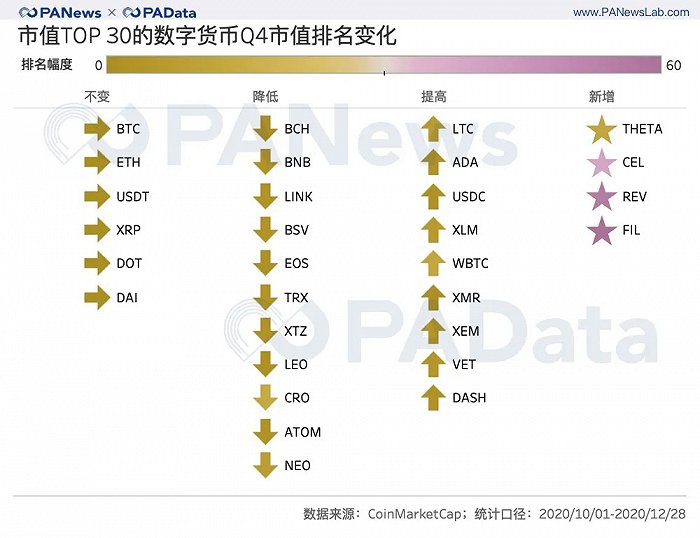四季度,新增资产市值排名也大幅上升。 THETA较上季度上升12位,CEL上升39位,REV上升55位,FIL上升至少60位(上季度未进入市值前100名)。 其中,FIL第四季度刚刚上线主网,因此挖矿产出币数量增加,流通量增加直接导致市值增加。 但从以往各季度的新增资产来看,虽然该季度市值排名大幅上升,但可持续性较差。 很多资产往往昙花一现,很快就从TOP 30中“跌落”。比如上个季度的新资产YFI,本季度市值仅排名第41位。