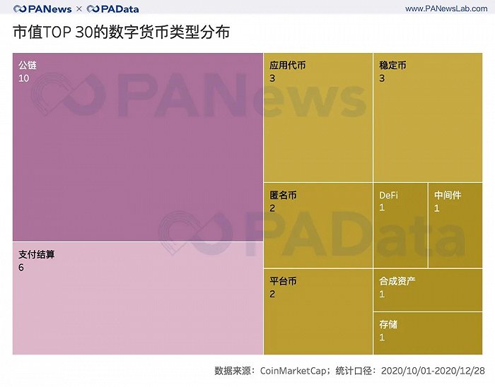 从市值前30名的数字货币类型来看,公链和支付结算代币仍然占据主导地位。 其他类型中,应用代币数量有所增加,主要是受到新来者REV和THETA的影响。 平台币数量减少,HT市值从第22位下降至第35位,跌出前30名。稳定币中,USDT、USDC、DAI市场份额稳定。