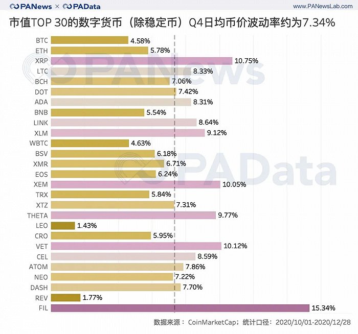 其中,BTC、ETH表现稳定。 币价日均波动率分别约为4.58%和5.78%,低于平均波动水平。 但与三季度相比,BTC波动性有所增加,ETH波动性略有下降。 此外,LEO、REV、WBTC、BNB波动性较低,日均币价波动小于5.5%。 相反,第四季度日币价波动较大的数字货币包括FIL、XRP、VET和XEM,均超过10%,其中FIL达到15.34%。