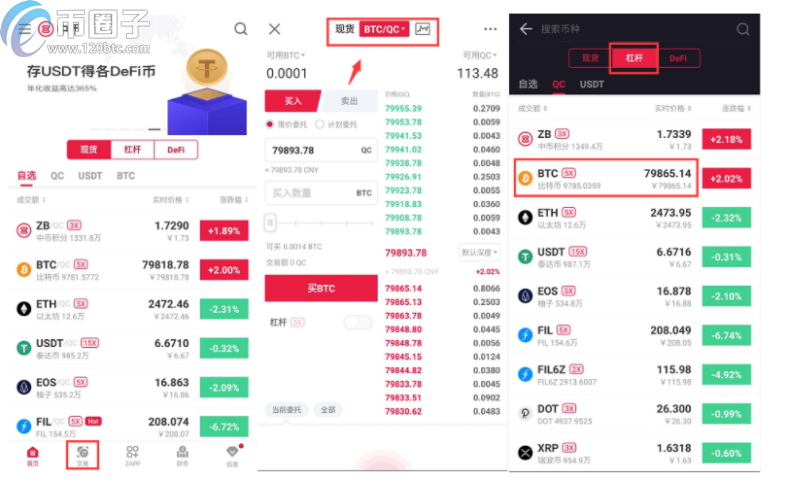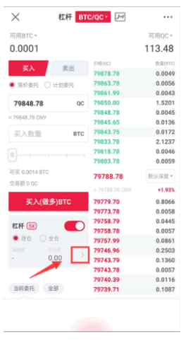 1.打开ZB官方APP并登录您的账户。 点击“BTC/QC杠杆”页面的“>”