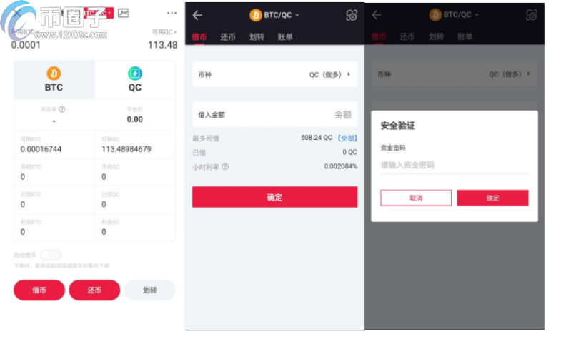 2、点击“借币”,在借币页面选择借币币种,输入借币金额点击“确定”,输入资金密码。 点击“确定”确认操作成功。