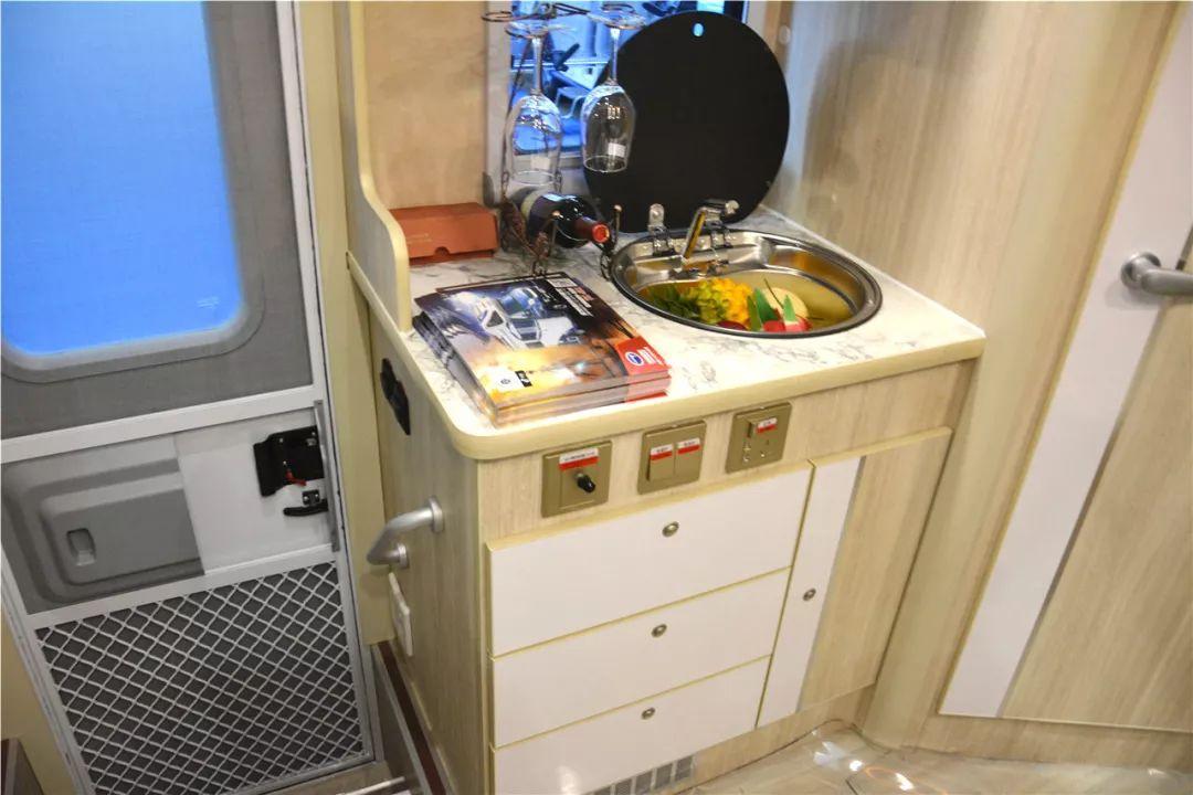 厨房区位于车门一侧,与接待区相对。 基本配置包括:带翻盖的圆形不锈钢水槽、微波炉、汽车抽油烟机。 与电磁炉配合使用,基本可以满足生活中烹饪的需要。 当然,停车时,您可以与车外的厨房配合使用,更好地享受户外烹饪的乐趣。