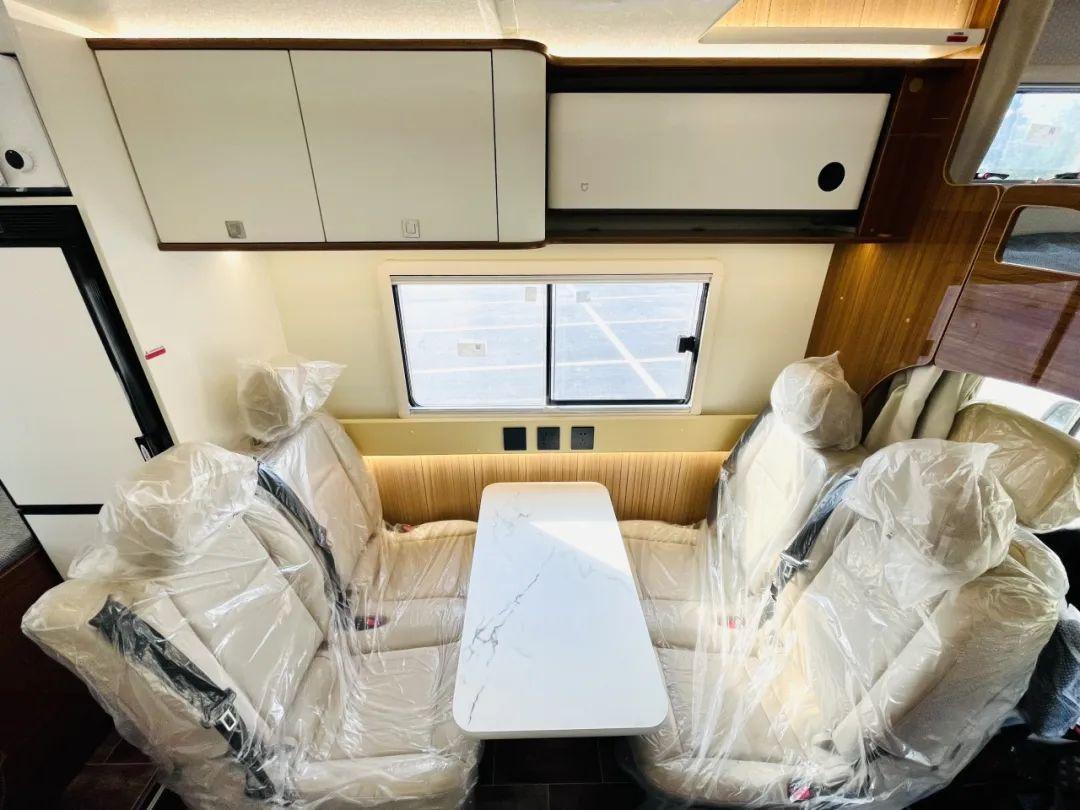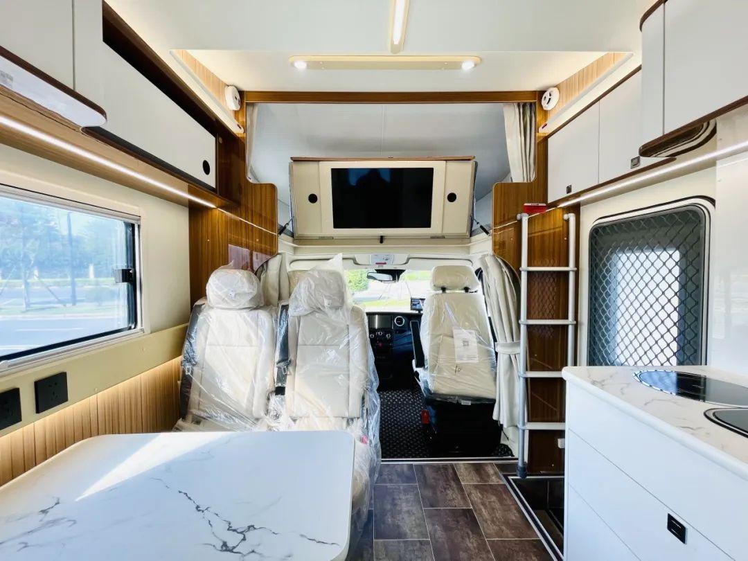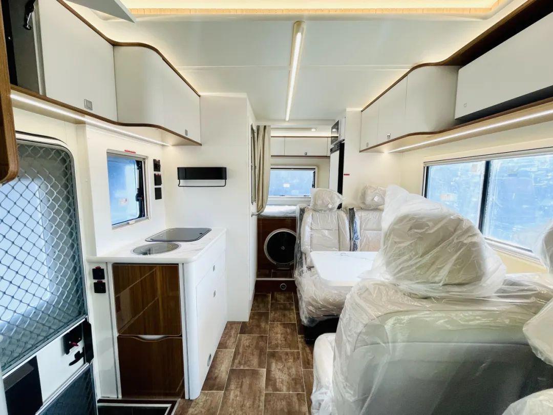 室内采用光泽棕红色木板和纯白色家具,营造出明亮、优雅的居住氛围。 内部布局清晰okx,前面是驾驶室和前床,中间是接待区和厨房区,后面是休息区和浴室。 车辆可搭载6人。