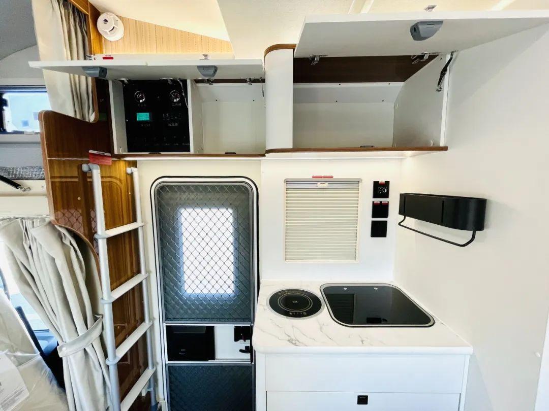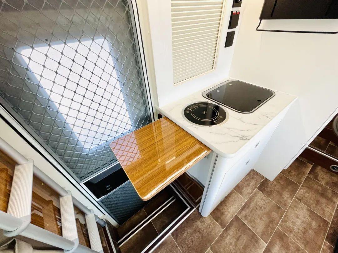 厨房区位于入口处,配有传统的电磁炉和水槽。 烹饪台下方设有储物柜,方便存放厨房用品。 值得注意的是,厨房水槽的一侧还设有一张可折叠的桌子。 这个设计非常巧妙。 不使用时可以折叠起来以节省空间,需要时展开以增加烹饪台的操作面积。