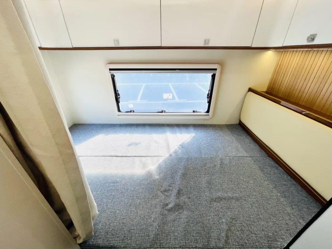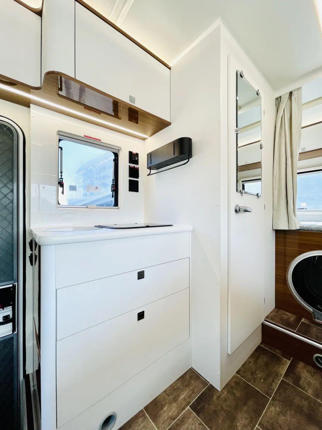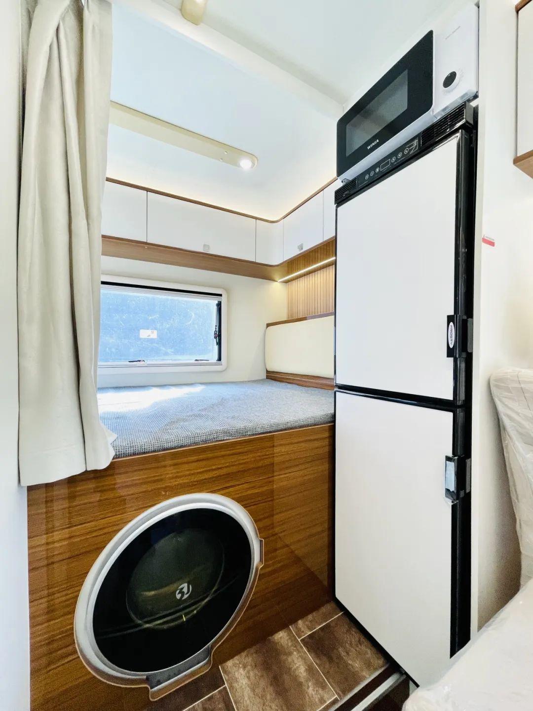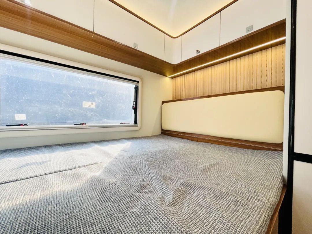 休息区采用卧式床设计,床尺寸为1180×,可容纳两人。 床采用灰白色和棕红色拼色靠背设计,给人一种居家床的温馨感觉。 床头上方设有悬挂式储物柜,提供充足的衣物存放空间。 大床下方设计有3公斤烘干机和洗衣机,让您在户外旅行时也能轻松洗衣服。 这些贴心的设计让骑行者即使在有限的空间内也能拥有家一般的便利和舒适。