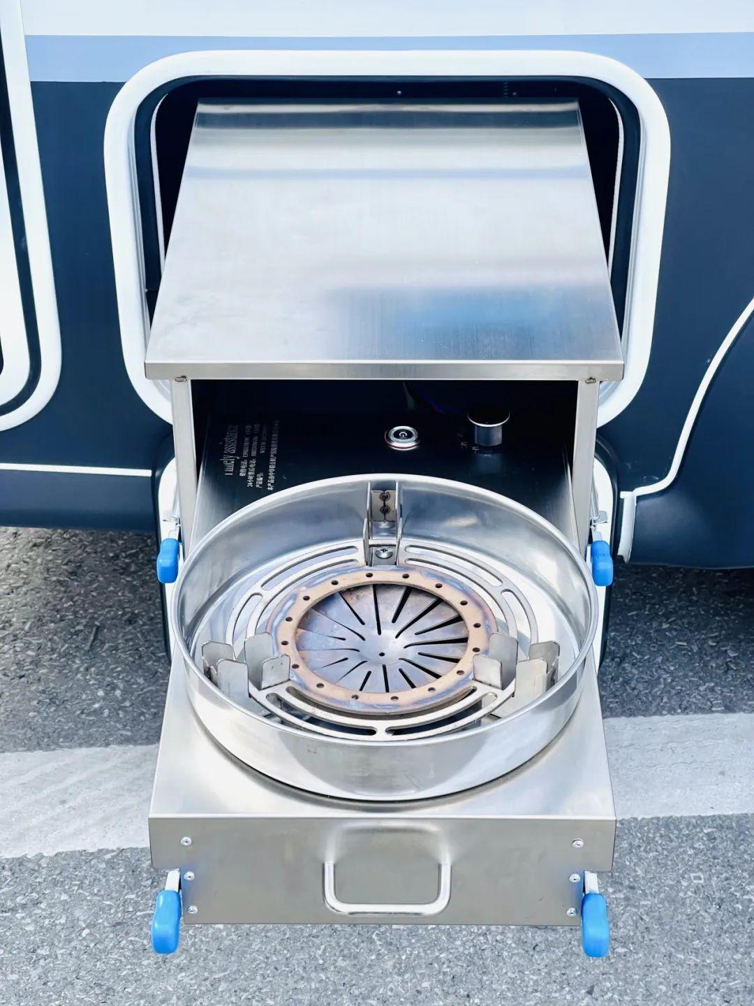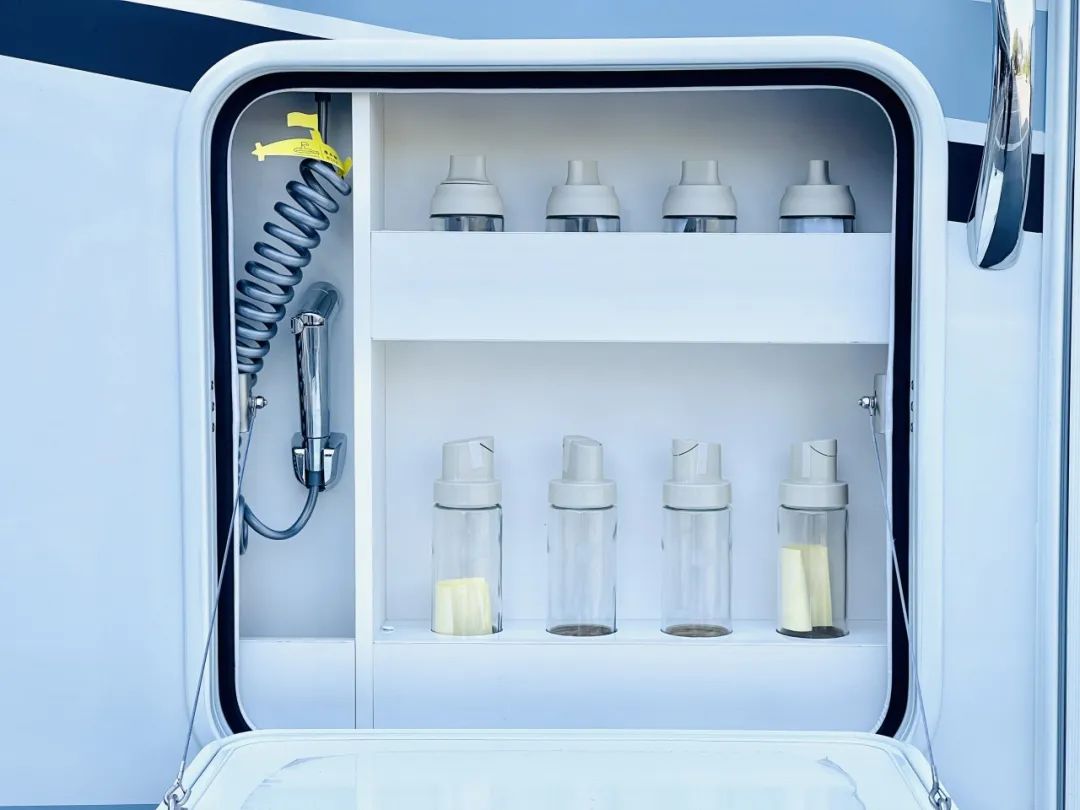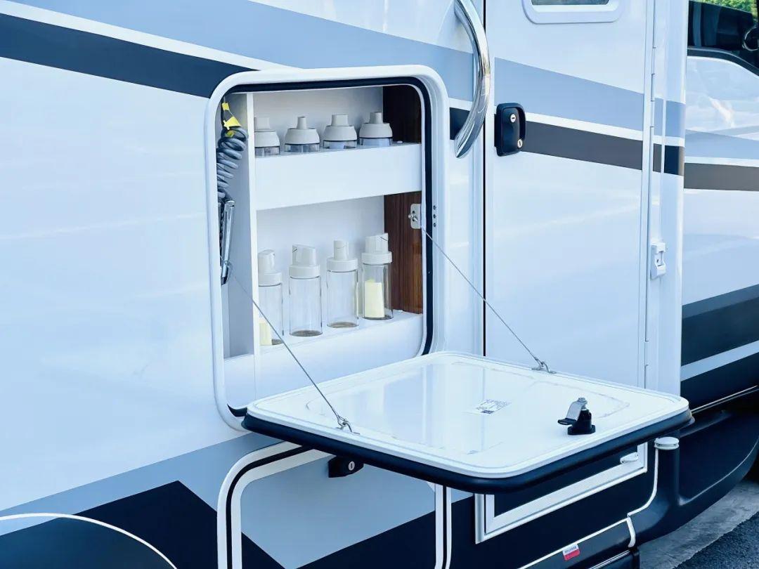 车侧的室外厨房设计得非常用心。 不仅为调料区提供储物功能,还利用储物格门的位置设计了折叠餐桌。 停车时,只需拉出小桌子即可展开。 有了存放东西或者切菜的空间,无论是露营还是户外聚会,这样的设计都能给用户带来更好的体验。