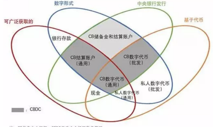 2018年,国际清算银行旗下支付和市场基础设施委员会(CPIM)提出“货币之花”,定义了央行数字货币的四个关键属性:发行机构、货币形式、可访问性和实施技术。 。 央行数字货币是“货币之花”(深灰色阴影区域)的中心,发行者是央行; 实现形式可以是反映传统账户的数字,即基于账户类型,或者基于名称中的一串特定密码。 使用共识算法验证的数字,即基于价值或基于令牌的算法。 根据应用场景不同,可分为批发端和零售端。 前者仅限于资金批发市场,如银行间支付清算、金融交易结算等,后者则在社会上流通。
