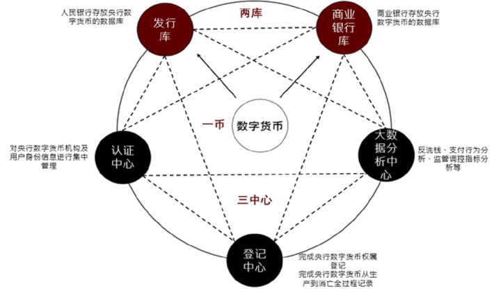“三个中心”是指认证中心、注册中心、大数据分析中心。 认证中心是央行对央行数字货币机构和用户身份信息的集中管理。 登记中心记录央行数字货币及对应用户的身份,完成所有权登记; 记录交易流向,完成央行数字货币的生产、流通、记账、消亡的整个登记流程。 大数据分析中心利用大数据、云计算等技术处理海量数据,主要用于反洗钱、支付行为分析和监管控制指标分析。