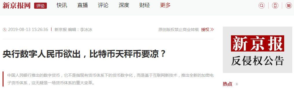央行推出数字货币并不是将现有货币体系下的货币数字化,而是基于新的互联网技术特别是区块链技术推出新的加密数字货币体系。 文章还称,“非主权数字货币也将逐渐降温”。 这引起了很多人的误解并讨论比特币是否会降温?