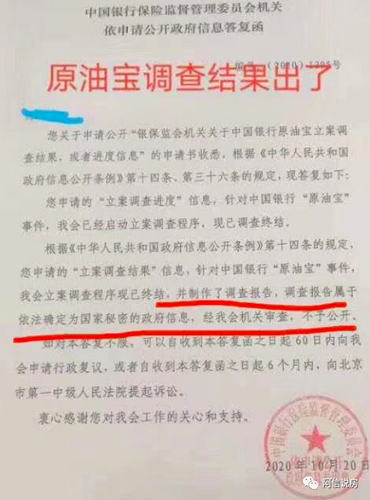 雪山财经:据投资者透露,银保监会已对中国银行“原油宝”事件展开调查。 目前调查已结束,并已出具调查报告。 据原油宝投资者向媒体反馈,这封回复函是投资者向银保监会申请政府信息公开而获得的回复函。 复印件上写明:“根据《中华人民共和国政府信息公开条例》第十四条的规定,您申请的《调查结果》信息,关于中国银行“原油宝”事件,中国银行的程序现已完成,并已出具调查报告。 调查报告属于依法确定为国家秘密的政府信息。 审查,不公开。”