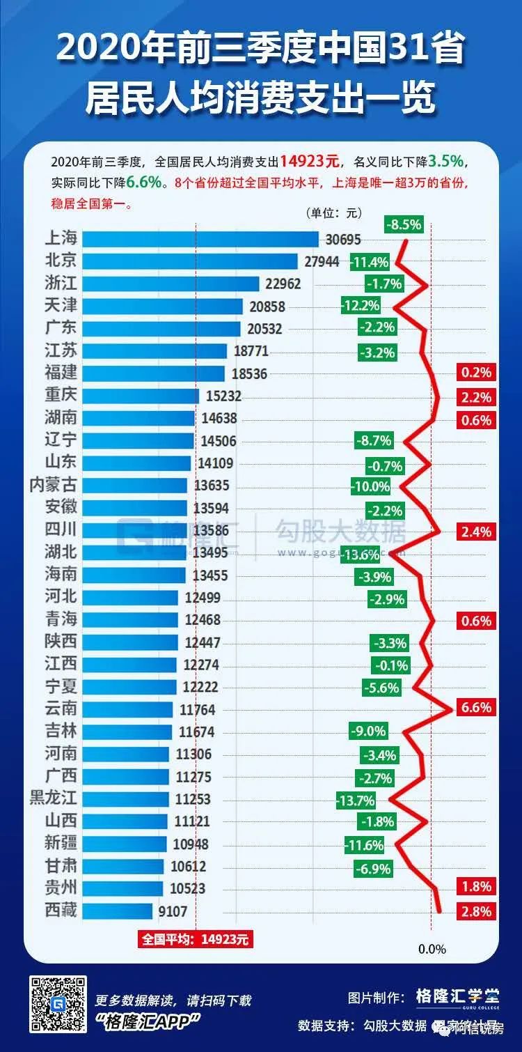2020年前三季度我国31个省份居民人均消费支付情况同比下降6.6%。