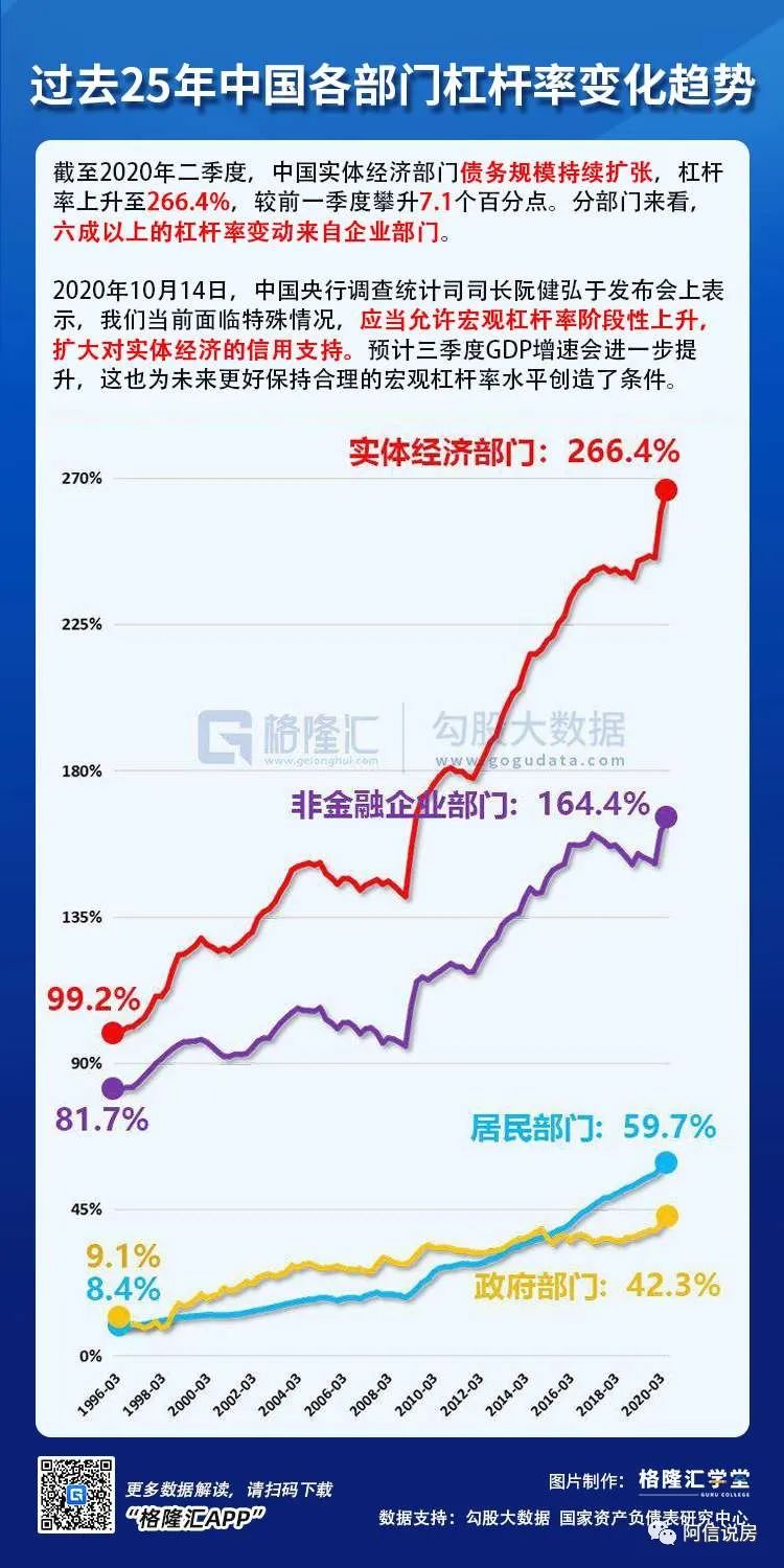 从图中可以看出,近25年来,居民、政府、企业的债务加速增长。 整体表现为债务规模不断扩大,其中企业部门最为夸张。 杠杆率越高,我们的风险就越大。