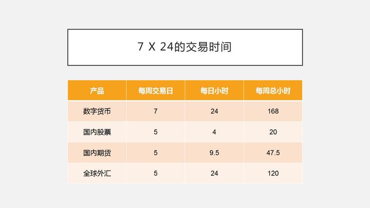 数字货币市场每周24/7的交易时间是A股市场的足足8倍,甚至比外汇市场还要长35%(不包括节假日)。