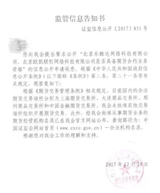 但当网友去找证监会时,得到的答案却更让人惊讶! 数字期货交易所不属于中国证监会的管理范围。 不过,从证监会的复信中可以看出,证监会尚未批准任何交易场所开展比特币等虚拟货币期货交易。 北京乐酷达网络科技有限公司()和北京欧凯联创网络科技有限公司(母公司)不具备中国证监会批准的期货业务相关资质。