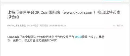OKEx刚成立时,官方利用其新平台OKEx推出比特币虚拟合约业务进行推广。