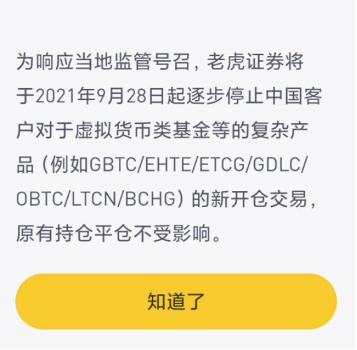 9月29日,老虎证券表示,响应当地监管号召,自9月28日起将逐步停止中国客户购买虚拟货币基金等复杂产品(如GBTC/EHTE/ETCG/GDLC/OBTC/LTCN/BCHG)现有头寸的新开仓和平仓不会受到影响。 9月24日,富途曾发出类似提醒欧易交易所,自10月1日起禁止GBTC、ETHE等股票新开仓。